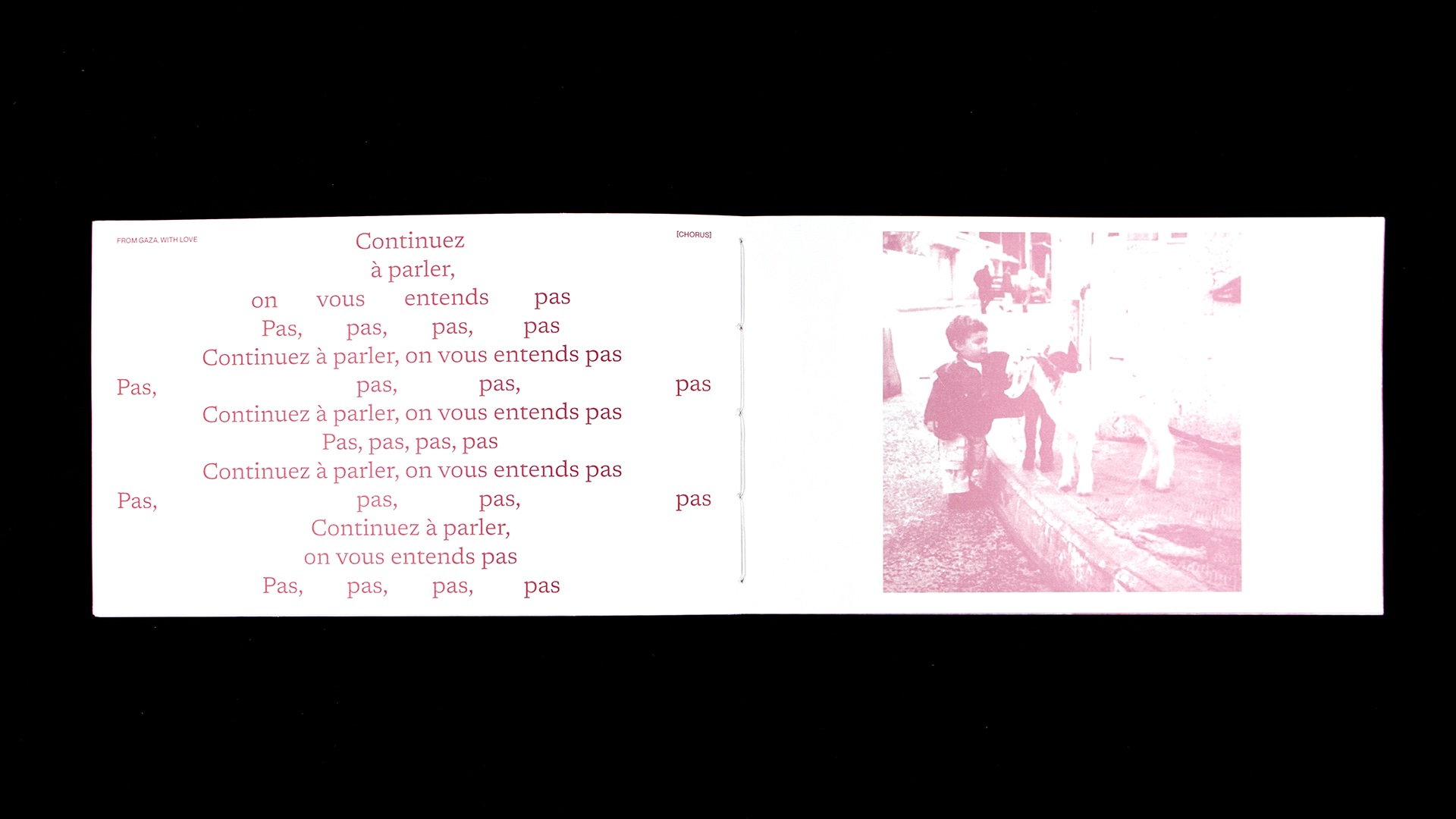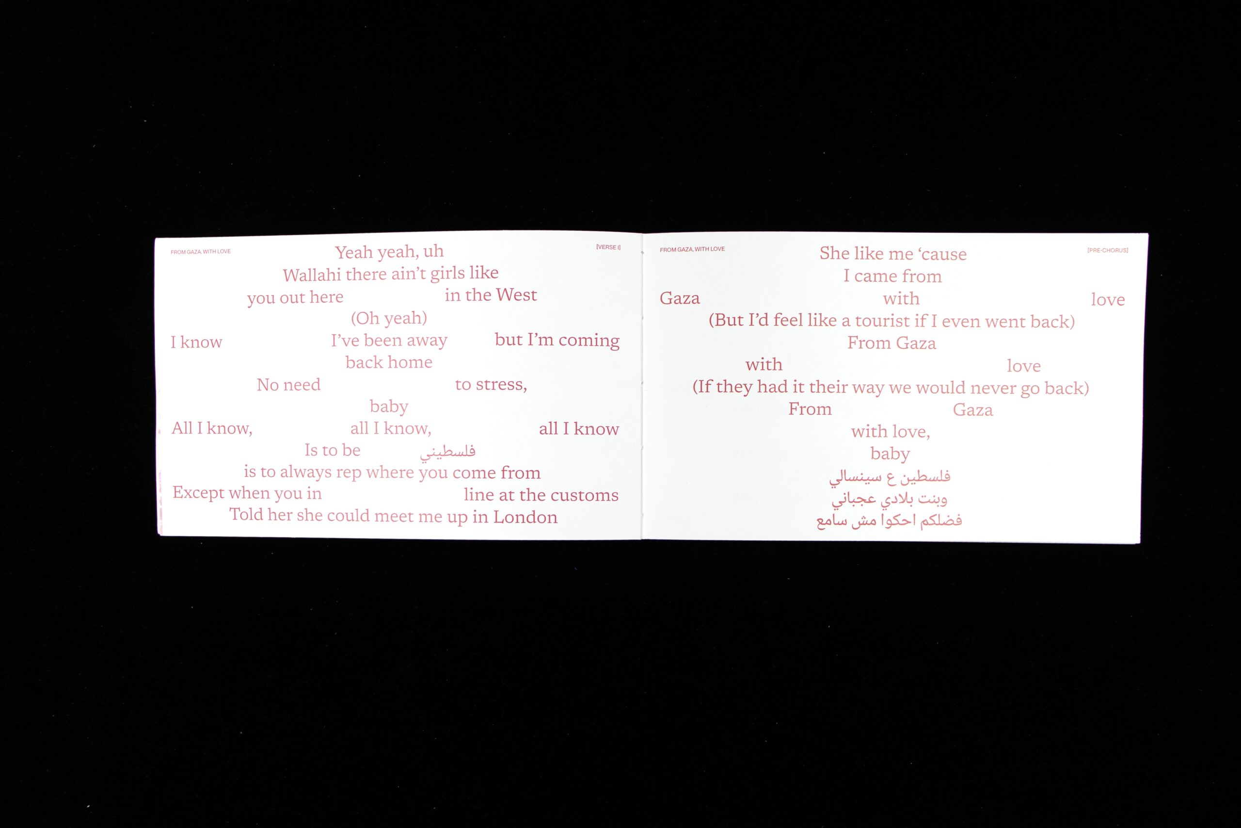 The book brings together texts by Saint Levant, Fady Joudah, May Ziadah, and Ibrahim Tuqan. Through their words, the project addresses themes of exile, memory, and identity. The format takes inspiration from personal letters to create an intimate reading experience.